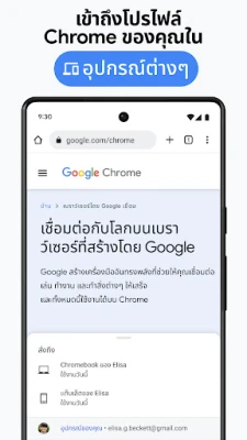 เชื่อมโยงโลกดิจิทัลของคุณอย่างไร้รอยต่อ ด้วยความสามารถของ Chrome ที่เข้าถึงได้บนทุกอุปกรณ์ ไม่ว่าจะเป็นโทรศัพท์ คอมพิวเตอร์ หรือแท็บเล็ต ข้อมูลสำคัญของคุณจะติดตามคุณไปทุกที่ ตั้งแต่บุ๊กมาร์ก แท็บที่เปิดอยู่ ไปจนถึงรหัสผ่าน เพียงคุณลงชื่อเข้าใช้ Google ข้อมูลทั้งหมดจะซิงค์กันโดยอัตโนมัติ นอกจากนี้ ยังสามารถจัดระเบียบหน้าเว็บด้วยฟังก์ชันกลุ่มแท็บ ช่วยให้คุณจัดหมวดหมู่และเข้าถึงแท็บต่างๆ ได้อย่างง่ายดาย และประหยัดเวลาอันมีค่าในการกรอกข้อมูลซ้ำๆ ด้วยระบบการป้อนข้อความอัตโนมัติ ที่พร้อมกรอกข้อมูลการชำระเงิน ที่อยู่ และรหัสผ่านที่บันทึกไว้ให้คุณอย่างรวดเร็วและปลอดภัย